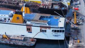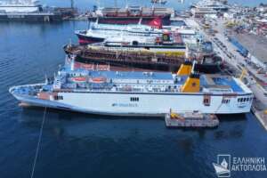 Το πλοίο, σύμφωνα με την ΕΡΤ, έχει αρχίσει να βάφεται σε λευκό χρώμα, ενισχύοντας τις φήμες που το θέλουν να αλλάζει όνομα και εταιρία. Τις εικόνες δημοσίευσε το ellinikiaktoploia.net.