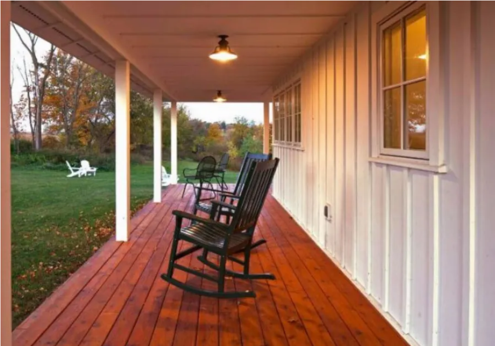 – Η βεράντα έρχεται σε αντίθεση με το λευκό του προκάτ σπιτιού. Τα χρώματα της βεράντας και της σκεπής το κάνουν πραγματικά να ξεχωρίζει.