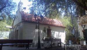 Μέσα σε ένα καταπράσινο τοπίο με παγκάκια, με τα δέντρα να ρίχνουν τη δροσερή σκιά τους, προβάλλει το μικρό ξωκκλήσι.