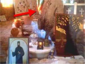 Δεν γύρισα ούτε πού να κοιτάξω ώσπου άκουσα την φωνή του να λέει, –» Ως πότε θα μ΄ έχεις εκεί πέρα; Κι΄ αυτός ( ό εργάτης ), πώς πέταξε το κεφάλι μου έτσι; Γύρισα τότε τρομαγμένη και τ ό ν ε ί δ α ! Ήταν ψηλός, με μάτια μικρά στρογγυλά πού τρεμόπαιζαν στις κόγχες τους. Έβλεπα τίς ρυτίδες του, και τα γένια του πού έφθαναν μέχρι τον λαιμό του. Το μαύρο ράσο του μαύρο με πτυχώσεις, και στο αριστερό του χέρι κρατούσε ένα φως υπέρλαμπρο ενώ με το δεξί ευλογούσε !… Ήταν ένα πλάσμα, 1.500 ετών, καί βρισκόταν μέ την δύναμι τού Χριστού ολοζώντανο, ακριβώς δίπλα μου!! –Συγχώρησέ με, τού είπα, και αύριο μόλις ξημερώσει ό Θεός την ημέρα του, θα σέ φροντίσω… Και αμέσως έγινε ά φ α ν τ ο ς !
