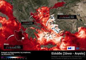 Έπειτα από την επεξεργασία δορυφορικών δεδομένων από τη μονάδα Meteo.gr του Εθνικού Αστεροσκοπείου Αθηνών, στο Σχήμα 1 παρουσιάζονται οι διαφορές της θερμοκρασίας στην επιφάνεια της θάλασσας, πριν (5 Ιουλίου) και μετά το κύμα καύσωνα (27 Ιουλίου 2023).