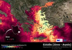 Ιδιαίτερα για την περιοχή του Νότιου Ιονίου, την Πέμπτη 27/07 η θερμοκρασία στην επιφάνεια της θάλασσας υπολογίστηκε πάνω από 30 °C, η οποία αποτελεί πολύ υψηλή τιμή για την εποχή (Σχήμα 2). Αντιθέτως, οι χαμηλότερες θερμοκρασίες στην επιφάνεια της θάλασσας, όπως διακρίνεται στο Σχήμα 2, μετρήθηκαν στην περιοχή του Ανατολικού Αιγαίου (~ 24 °C).