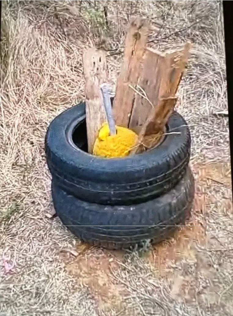 Είδαμε 13 άτομα αλλοδαπούς οι οποίοι ήταν πέριξ ενός αντικειμένου και δύο εξ’αυτών προσπαθούσαν να του βάλουν φωτιά κρατώντας ένα πράγμα που έμοιαζε με μπαλόνι το οποίο είχε βενζίνη την οποία την κατάλαβα από τη μυρωδιά και κρατούσε ένα μαχαίρι περίπου 30 εκατοστών με το οποίο προσπαθούσε να κάνει σπίθα. Τα αντικείμενα που προσπαθούσαν να βάλουν φωτιά ήταν δύο λάστιχα το ένα πίσω από το άλλο παραγεμισμένο με πισσαρισμένα ξερά σανίδια και στη μέση υπήρχε μια τρύπα προκειμένου να μπει το εύφλεκτο υλικό και στο κέντρο αυτής μια μπάλα με αφρολέξ το οποίο είναι εξαιρετικά εύφλεκτο.