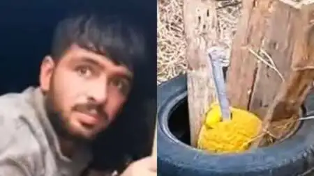 Είδαμε 13 άτομα αλλοδαπούς οι οποίοι ήταν πέριξ ενός αντικειμένου και δύο εξ’αυτών προσπαθούσαν να του βάλουν φωτιά κρατώντας ένα πράγμα που έμοιαζε με μπαλόνι το οποίο είχε βενζίνη την οποία την κατάλαβα από τη μυρωδιά και κρατούσε ένα μαχαίρι περίπου 30 εκατοστών με το οποίο προσπαθούσε να κάνει σπίθα. Τα αντικείμενα που προσπαθούσαν να βάλουν φωτιά ήταν δύο λάστιχα το ένα πίσω από το άλλο παραγεμισμένο με πισσαρισμένα ξερά σανίδια και στη μέση υπήρχε μια τρύπα προκειμένου να μπει το εύφλεκτο υλικό και στο κέντρο αυτής μια μπάλα με αφρολέξ το οποίο είναι εξαιρετικά εύφλεκτο.