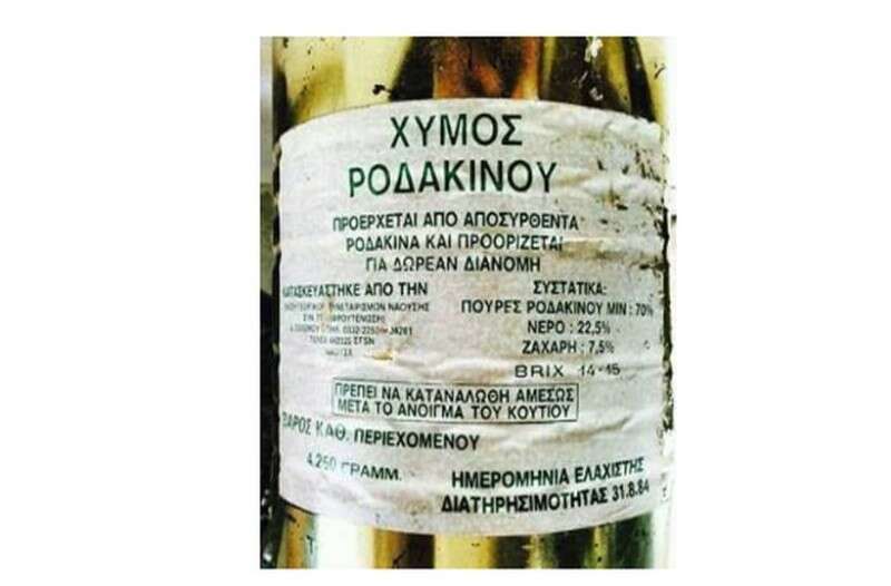 Και για να γνωρίζετε όλες τις λεπτομέρειες, συσκευαζόταν μέσα σε κάτι κονσέρβες ενώ πάνω του υπήρχε και το… ξεκαθάρισμα από που προέρχoνται τα ροδάκινα που αποτελούσαν το βασικό συστατικό του περιεχομένου.