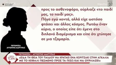 Γείτονες που άκουσαν τον εκκωφαντικό ήχο της τζαμαρίας και τα ουρλιαχτά της θείας έσπευσαν στο σημείο και κάλεσαν άμεσα ασθενοφόρο. Η θεία προσπάθησε να σταματήσει την αιμορραγία με όσα μέσα διέθετε, ωστόσο οι κακώσεις ήταν πολύ σοβαρές.