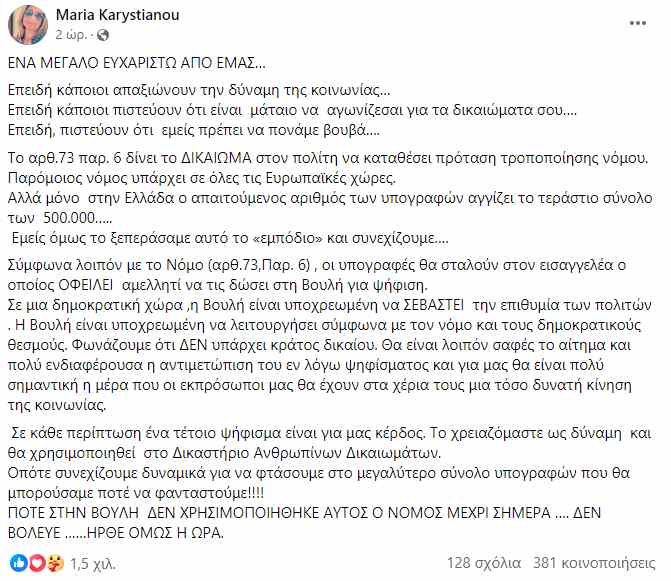 Η κυρία Καρυστιανού για αυτό ακριβώς το λόγο με μια ανάρτηση στην ομάδα που έχει δημιουργηθεί στο facebook ως «Σύλλογος Συγγενών Θυμάτων Τεμπών 2023» θέλησε να ευχαριστήσει όσους υπέγραψαν το ψήφισμα: