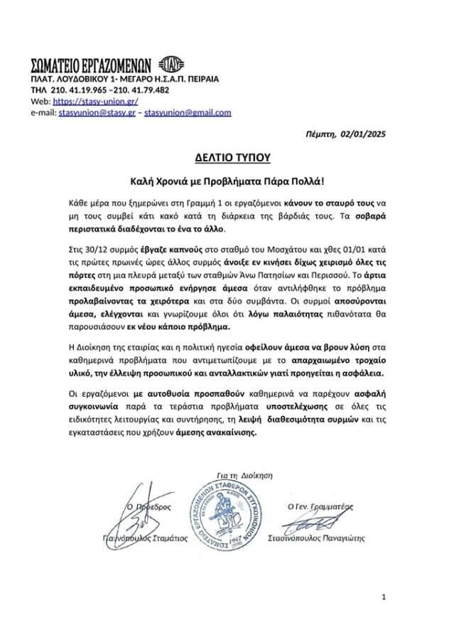 Οι εργαζόμενοι επισημαίνουν πως η διοίκηση της εταιρείας και η πολιτική ηγεσία οφείλουν άμεσα να βρουν λύση στα προβλήματα που αντιμετωπίζουν, «με το απαρχαιωμένο υλικό, τη λειψή διαθεσιμότητα συρμών και τις εγκαταστάσεις που χρήζουν άμεσης ανακαίνισης».