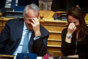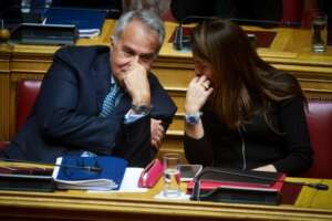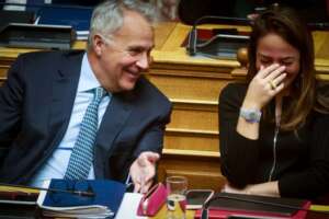 Όπως φαίνεται μέσα από τα φωτογραφικά καρέ του πρακτορείου Eurokinissi, οι Μάκης Βορίδης και Δόμνα Μιχαηλίδου είχαν ξεκαρδιστεί στα γέλια στα έδρανα της Κυβέρνησης.