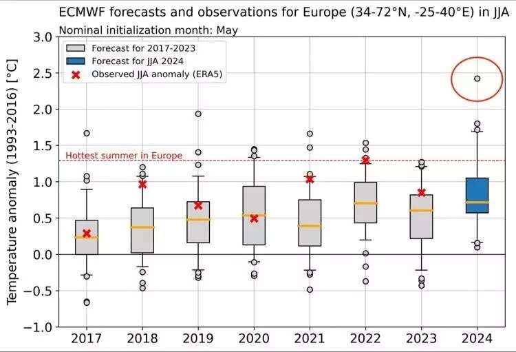 Πιο συγκεκριμένα, σύμφωνα με το Ευρωπαϊκό Κέντρο Μεσοπρόθεσμων Μετεωρολογικών Προγνώσεων (ECMWF) το καλοκαίρι του 2024 αναμένεται να ζήσουμε δύσκολες καταστάσεις, αν λάβουμε υπόψη την πρόβλεψη της θερμοκρασίας όπως φαίνεται και στον παρακάτω πίνακα. Μάλιστα, το κέντρο με τα προγνωστικά δεδομένα που βγάζει μέχρι και σήμερα πέφτει πάντα μέσα και με μεγάλη ακρίβεια.