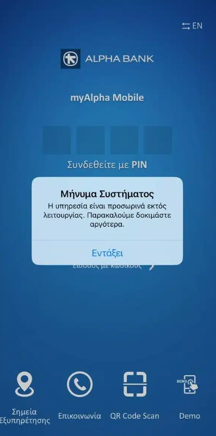 Παρατηρούνται περιστασιακές καθυστερήσεις στη σύνδεση ή/και την πραγματοποίηση συναλλαγών μέσω των Alpha Web και Mobile Banking. Απολογούμαστε για την ταλαιπωρία και εργαζόμαστε για την αντιμετώπιση του ζητήματος. Σας ευχαριστούμε για τη κατανόηση».