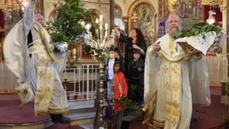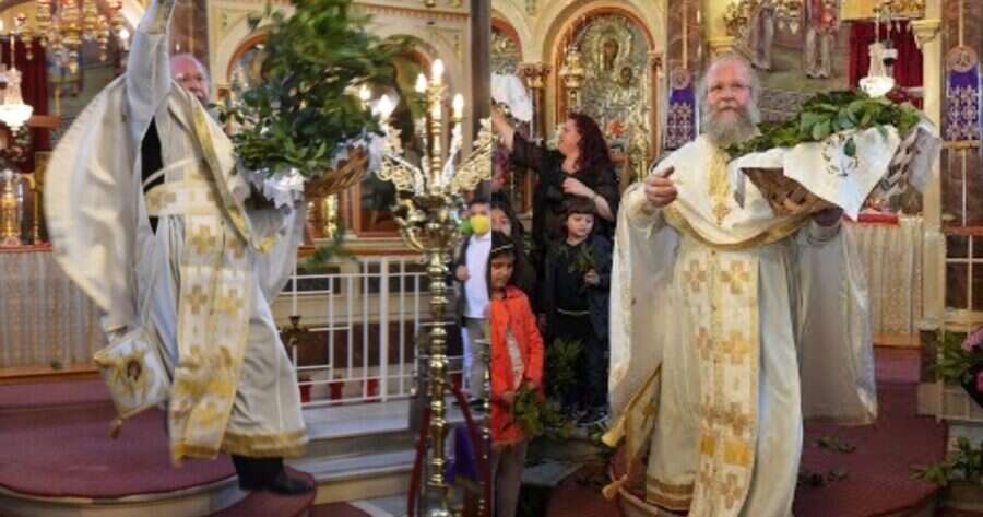 Ο ιερέας σκόρπισε δαφνόφυλλα, σύμβολα της νίκης του Χριστού.