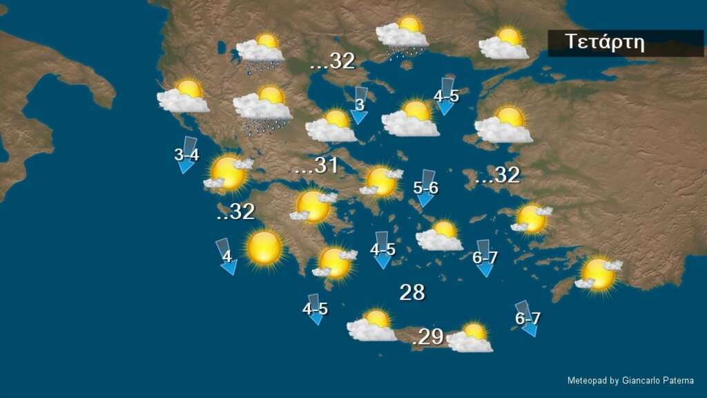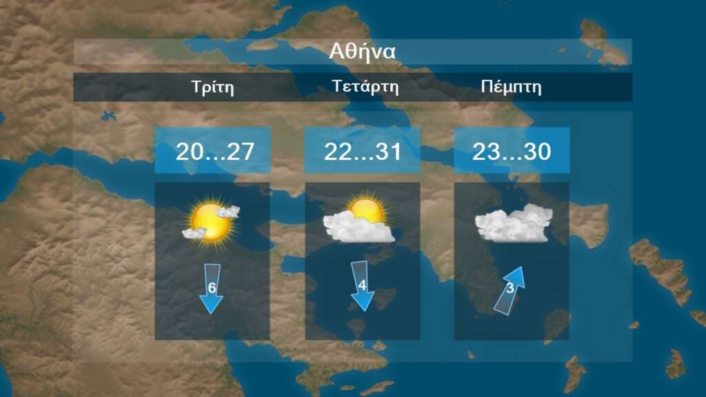 Οι άνεμοι στα δυτικά θα πνέουν από ανατολικές διευθύνσεις 3 με 5 μποφόρ. Στα ανατολικά θα πνέουν από βόρειες διευθύνσεις 3 με 5, στο βόρειο Αιγαίο βορειοανατολικοί 6 με 7 και στα νότια μεταβλητοί 3 με 4 μποφόρ. Η θερμοκρασία θα σημειώσει μικρή πτώση 2 με 3 βαθμούς σε όλη τη χώρα, φτάνοντας στα δυτικά τους 23-24 και στα ανατολικά τους 28 με 30 βαθμούς κελσίου.