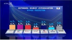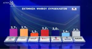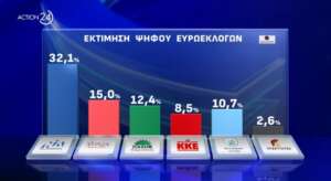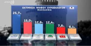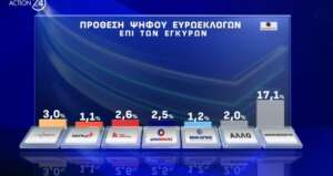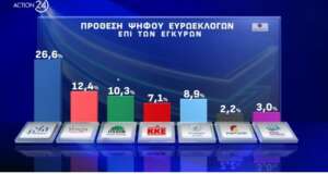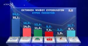 Στην δημοσκόπηση, που παρουσιάστηκε στο Κεντρικό δελτίο ειδήσεων του Action24 με τον Βασίλη Τσεκούρα, η ΝΔ έχει «αέρα» κυριαρχίας και μάλιστα μπορεί να υπερβεί και το ποσοστό των προηγούμενων ευρωεκλογών όπου είχε λάβει 33,1%. Στη δεύτερη θέση παγιώνεται και σε αυτή τη δημοσκόπηση ο ΣΥΡΙΖΑ πολύ χαμηλότερα ωστόσο, ενώ το ΠΑΣΟΚ ακόμη και στο ταβάνι του είναι πίσω από το κόμμα Κασσελάκη.