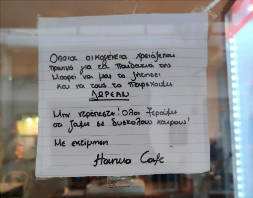 Όπως, για παράδειγμα, αν περάσει κανείς έξω από ένα μαγαζί στην παλιά πόλη του Ρεθύμνου και διαβάσει το σημείωμα που υπάρχει στην πόρτα θα σκεφτεί ακριβώς αυτό: ότι δεν έχει χαθεί κάθε ελπίδα και υπάρχει ανθρωπιά και αλληλεγγύη στις μέρες μας. Το μαγαζί προσφέρει δωρεάν πρωινό σε όσες οικογένειες έχουν ανάγκη και δεν μπορούν να το παρέχουν στα παιδιά τους.