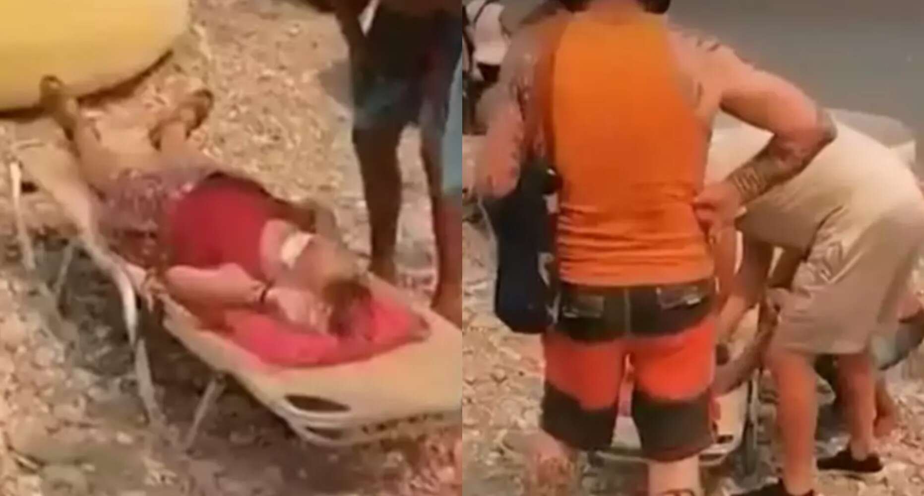 Η γυναίκα, η οποία παραμένει ξαπλωμένη στην παραλία, δέχεται τις πρώτες βοήθειες από όσους βρέθηκαν γύρω της, οι οποίοι προσπάθησαν να τη βοηθήσουν έως ότου φτάσει το ΕΚΑΒ.