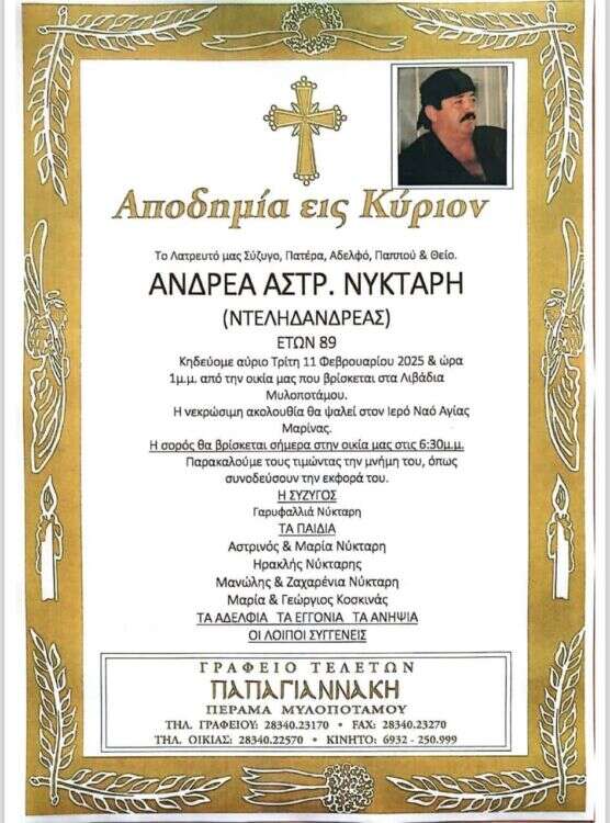 Πρώτος πέθανε ο πατέρας του γνωστού Κρητικού επιχειρηματία, Ηρακλή Νύκταρη, Ανδρέας, σε ηλικία 89 ετών και την ημέρα της κηδείας του η σύζυγός του Γαρυφαλλιά σε ηλικία περίπου 76 ετών.