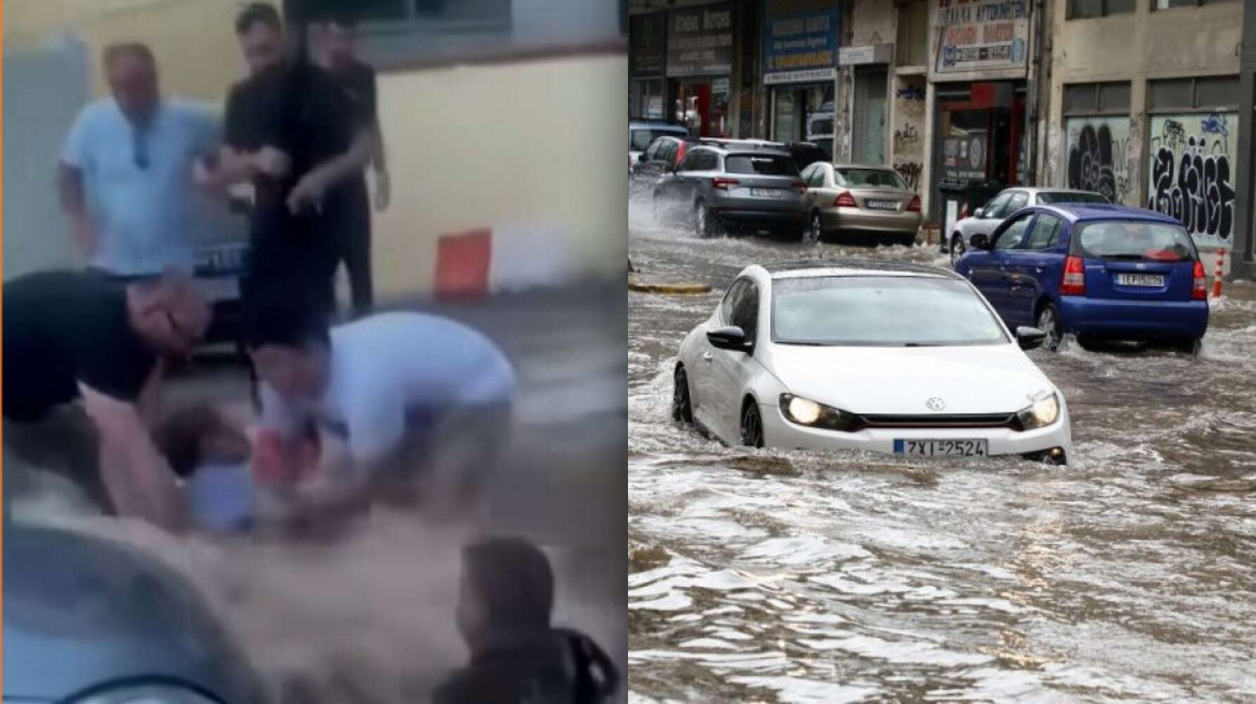 Το βίντεο δείχνει έναν πολίτη να βρίσκεται κάτω και να έχει παρασυρθεί από τον «χείμαρρο» που δημιουργήθηκε στην κεντρική οδική αρτηρία. Από τη μία πλευρά τον συγκρατεί ένα αυτοκίνητο, ωστόσο ο ίδιος είναι πεσμένος και καλύπτεται από τα νερά.