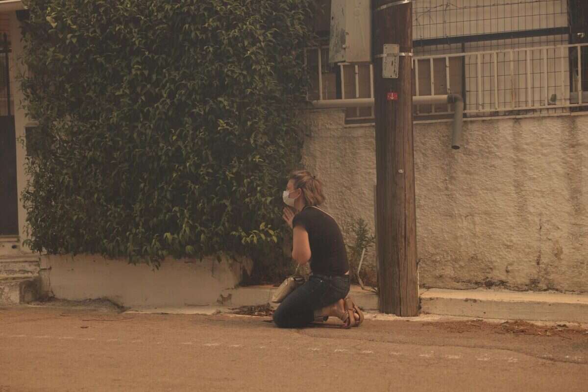 Συγκλονιστική είναι η φωτογραφία με γυναίκα να έχει πέσει στα γόνατα και να προσεύχεται ελπίζοντας σε ένα θαύμα, ελπίζοντας ότι όταν γυρίσει το σπίτι της θα έχει σωθεί και πώς η πύρινη κόλαση θα έχει σταματήσει και δεν θα έχει καταστρέψει τα πάντα στο πέρασμά της.
