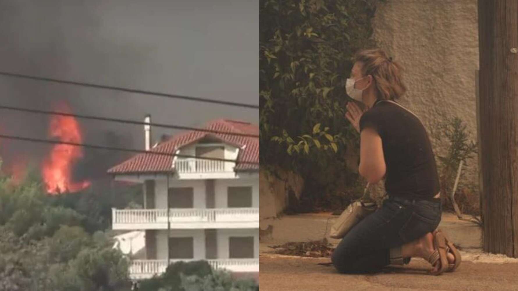 Συγκλονιστική είναι η φωτογραφία με γυναίκα να έχει πέσει στα γόνατα και να προσεύχεται ελπίζοντας σε ένα θαύμα, ελπίζοντας ότι όταν γυρίσει το σπίτι της θα έχει σωθεί και πώς η πύρινη κόλαση θα έχει σταματήσει και δεν θα έχει καταστρέψει τα πάντα στο πέρασμά της.
