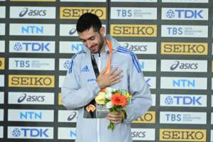 Στο στήθος του Μίλτου Τεντόγλου κρεμάστηκε το χρυσό μετάλλιο που κέρδισε στο Παγκόσμιο πρωτάθλημα στίβου της Βουδαπέστης.