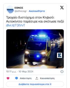 Αυτοκίνητο παρέσυρε και σκότωσε πεζό στον Κηφισό, το βράδυ της Κυριακής.