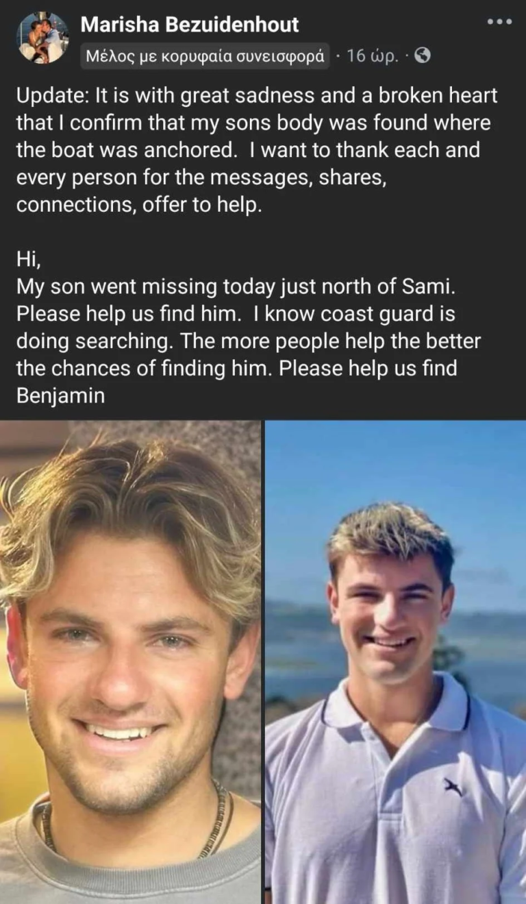 Η μητέρα του 20χρονου, μόλις ενημερώθηκε για την τραγική είδηση, έκανε μια συγκινητική ανάρτηση. Στην ανάρτηση αυτή, έγραψε ότι: «με μεγάλη θλίψη και ραγισμένη καρδιά επιβεβαιώνω ότι το σώμα του γιου μου βρέθηκε εκεί όπου ήταν αγκυροβολημένο το σκάφος. Θέλω να ευχαριστήσω κάθε άτομο για τα μηνύματα, τις κοινοποιήσεις, τις συνδέσεις, την προσφορά βοήθειας».