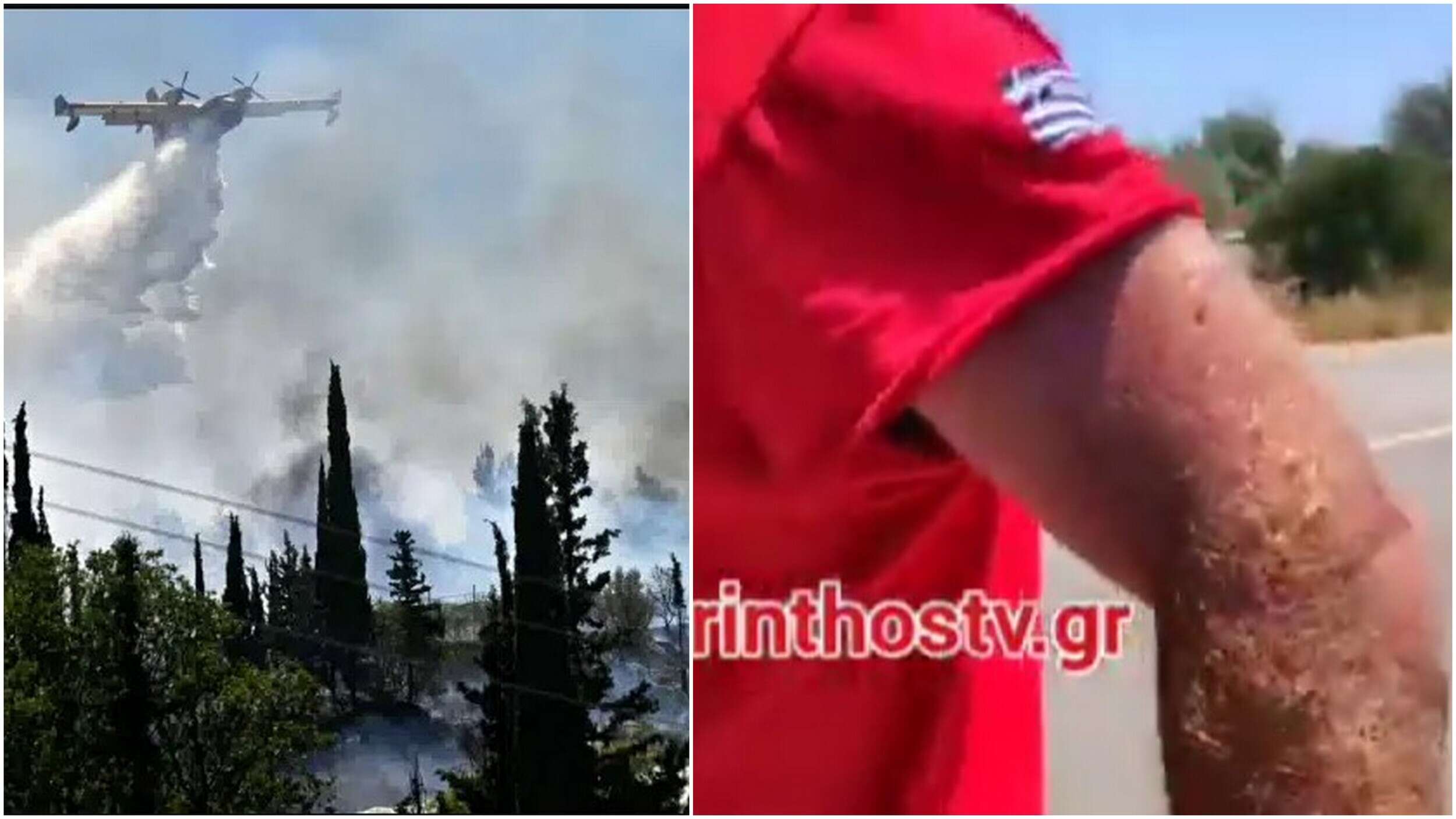 Οι πυροσβέστες κατάφεραν να σωθούν ωστόσο εκείνος τραυματίστηκε και μεταφέρθηκε από εθελοντές στο Νοσοκομείο Κορίνθου με ελαφρά εγκαύματα. Οι φλόγες έφτασαν μέχρι το όχημά του προκαλώντας φθορές.