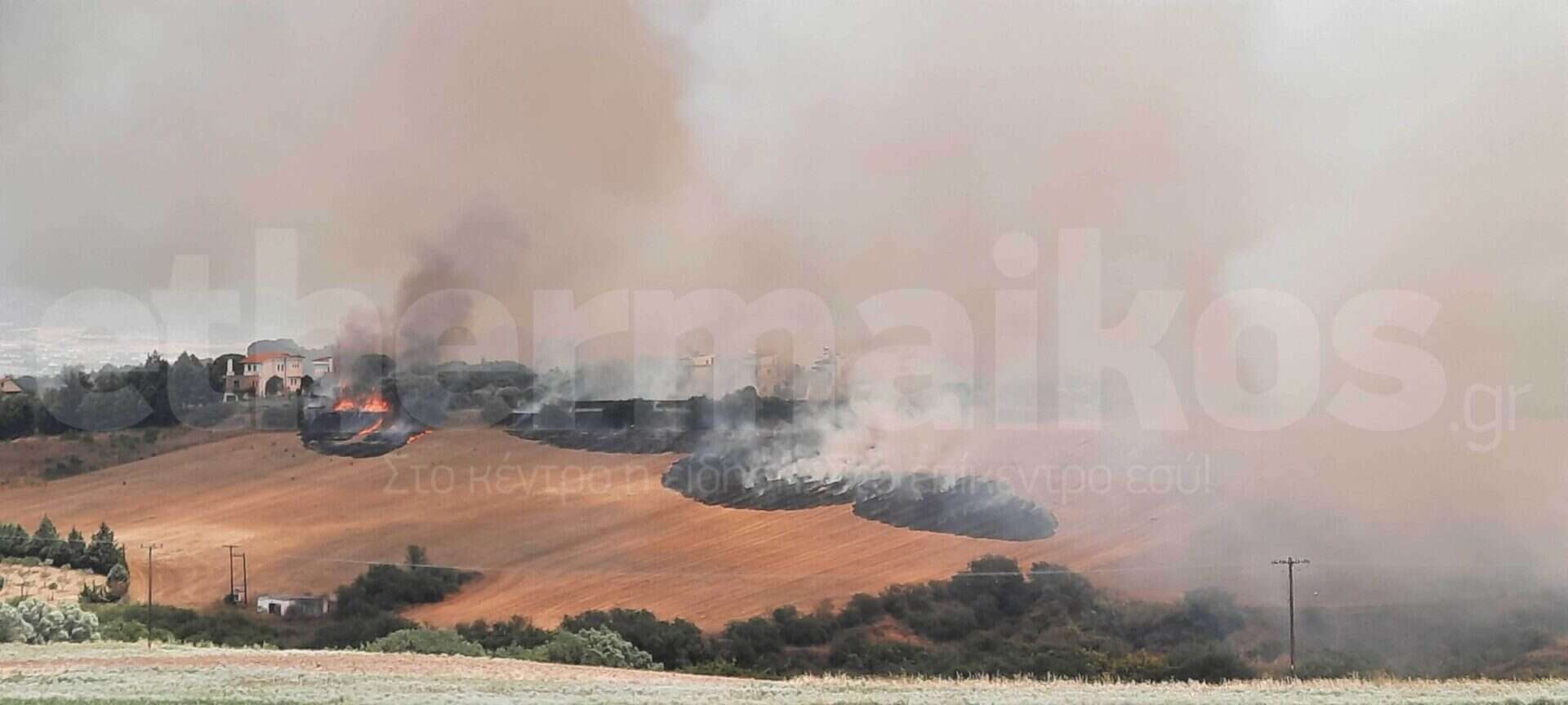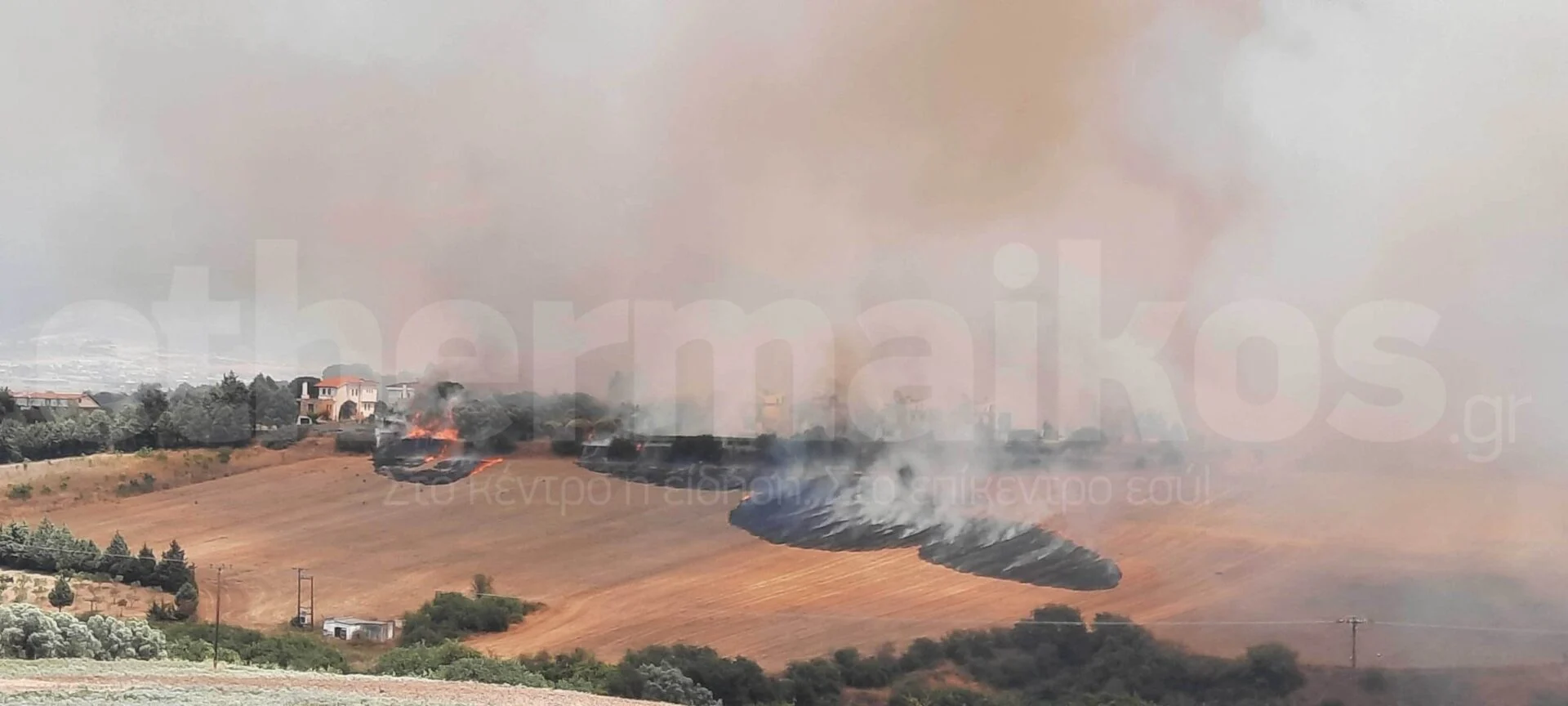 Στις φλόγες έχουν παραδοθεί σπίτια στον οικισμό Καμήλα, λόγω της φωτιάς στη Θέρμη Θεσσαλονίκης.