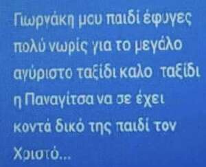 «Γιωργάκη μου, παιδί έφυγες πολύ νωρίς για το μεγάλο αγύριστο ταξίδι. Καλό ταξίδι, η Παναγίτσα να σε έχει κοντά, δικό της παιδί τον Χριστό», έγραψε χαρακτηριστικά η απαρηγόρητη μητέρα.