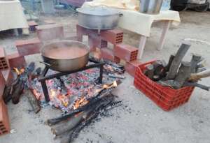 Μια υπαίθρια κουζίνα, λίγα μέτρα μακριά από τα «σύνορα» του Αγίου Όρους έστησαν 20 σεφ. Άναψαν φωτιές τοποθετώντας ξύλα στη γη σε μικρές εστίες τις οποίες είχαν οριοθετήσει με τούβλα και όταν ετοιμάστηκαν τα κάρβουνα, έβαλαν επάνω τα σκεύη με το φαγητό.