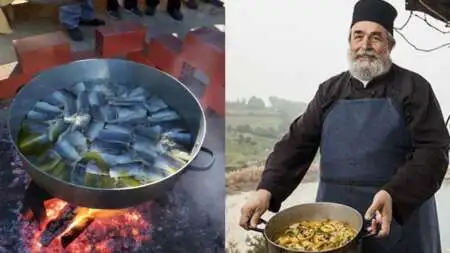 Το πρώτο πιάτο περιλαμβάνει τριών ειδών κεφτέδες, από ψάρι, από ταραμά και ρεβίθι, σερβιρισμένους με φάβα. «Τους κεφτέδες προετοίμασαν εστιατόρια της περιοχής. Εμείς εδώ επιτόπου θα φτιάξουμε χταπόδι γιουβέτσι με κριθαράκι και στη συνέχεια θα κάνουμε ψάρι με κολοκυθάκια στον ταβά, μαγειρεμένα με κρεμμυδόζουμο και με την Αγιορείτικη φιλοσοφία και τεχνική», συμπλήρωσε.