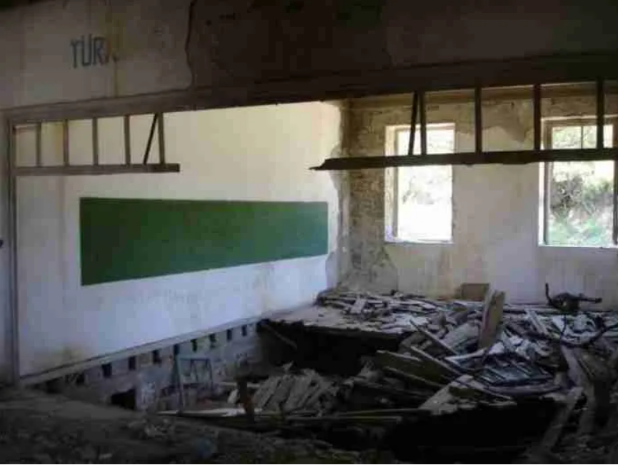 Το εγκαταλελειμμένο σχολείο (RUM – Ρωμιών) στο χωριό Αγρίδια (Tepeköy) το 2007. Πλέον έχει ανακαινιστεί και επαναλειτουργεί.