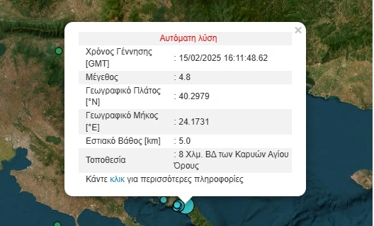 Ισχυρός σεισμός, μεγέθους 4,8 της κλίμακας Ρίχτερ, σημειώθηκε το απόγευμα του Σαββάτου (15/02) στο Άγιον Όρος.