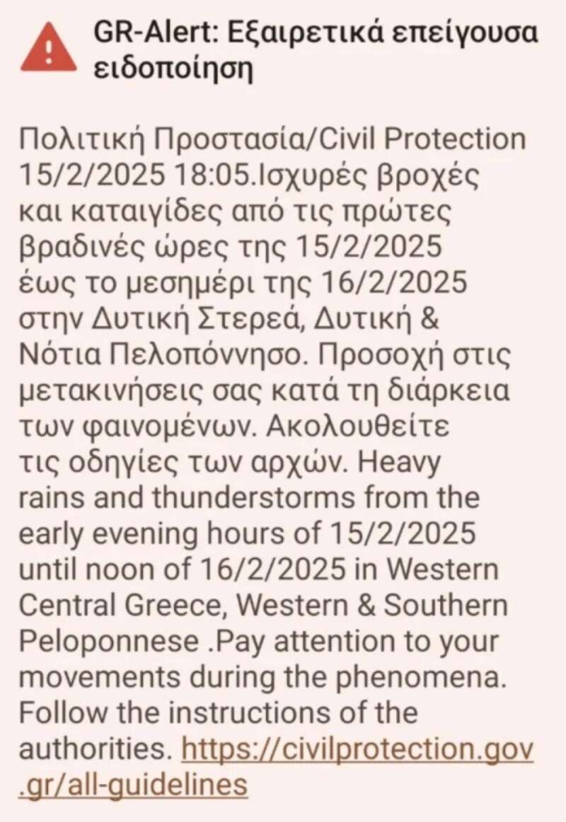 Το μήνυμα προειδοποιεί για έντονες βροχοπτώσεις και καταιγίδες από τις βραδινές ώρες του Σαββάτου (15/2) έως το μεσημέρι της Κυριακής (16/2), εφιστώντας την προσοχή των πολιτών στις μετακινήσεις τους. Παράλληλα, τους καλεί να συμμορφώνονται με τις οδηγίες των αρμόδιων αρχών για την ασφάλειά τους.