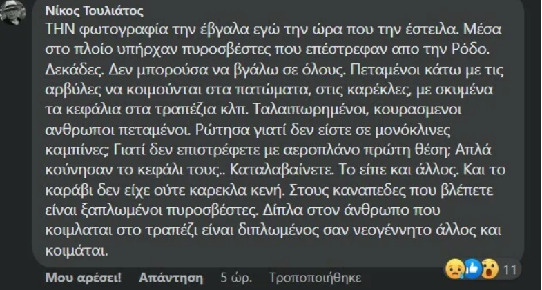 Σε φωτογραφία, που όπως ανέφερε τράβηξε ο ίδιος ο κ. Τουλιάτος, διακρίνονται στελέχη της πυροσβεστικής που επιστρέφουν από το νησί της Ρόδου να ακουμπούν πάνω σε τραπέζια του καταστρώματος για να μπορέσουν να κοιμηθούν.