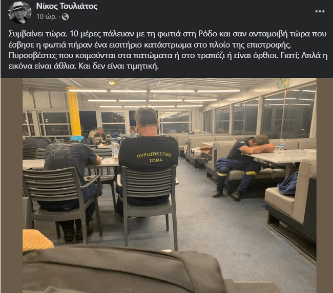 Σύμφωνα με καταγγελία του καταξιωμένου Έλληνα μουσικού, Νίκου Τουλιάτου οι πυροσβέστες που έδωσαν τιτάνια μάχη με τις φωτιές στη Ρόδο επέστρεφαν στα σπίτια τους σε άθλιες συνθήκες. Εικόνες ντροπής για τη χώρα μας, καθώς προσπαθούσαν να κοιμηθούν μετά από όλη αυτή την ταλαιπωρία, στο κατάστρωμα πλοίου αντί να τους φιλοξενήσουν σε καμπίνες.