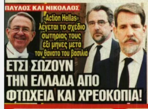 Αυτή τη φορά όμως εξώφυλλο περιοδικού με τίτλο: «Έτσι σώζουν την Ελλάδα από τη φτώχεια και τη χρεοκοπία οι Παύλος και Νικόλαος», πηγαίνουν την υπόθεση ένα βήμα παραπάνω. Η εξήγηση όμως «Action Hellas, λέγεται το σχέδιο σωτηρίας τους έξι μήνες μετά τον θάνατο του βασιλιά», προφανώς αναφέρεται στη βοήθεια του προσφέρουν σε μία εξαιρετικά σημαντική δράση!
