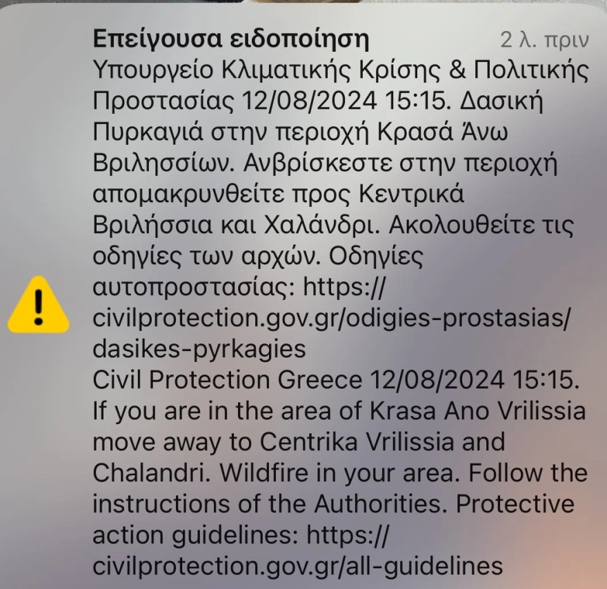 Μήνυμα 112 για την εκκένωση της περιοχής Κρασά Άνω Βριλησσίων