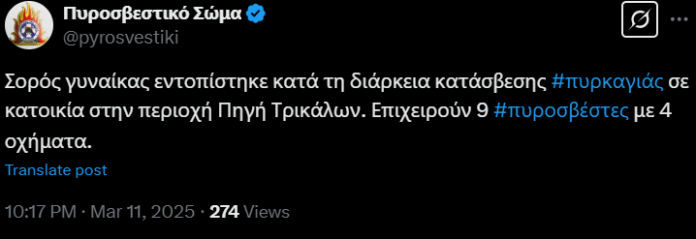 «Σορός γυναίκας εντοπίστηκε κατά τη διάρκεια κατάσβεσης #πυρκαγιάς σε κατοικία στην περιοχή Πηγή Τρικάλων. Επιχειρούν 9 #πυροσβέστες με 4 οχήματα».
