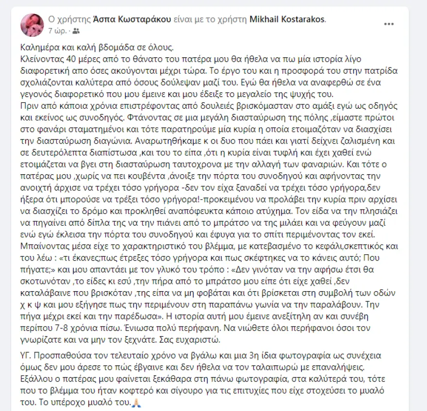 Με ανάρτησή της στο Facebook, η κόρη του Μιχάλη Κωσταράκου, Άσπα, διηγείται μια συγκινητική ιστορία που βίωσε μαζί του πριν από λίγα χρόνια, η οποία «έδειξε το μεγαλείο της ψυχής του».