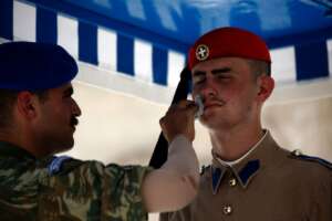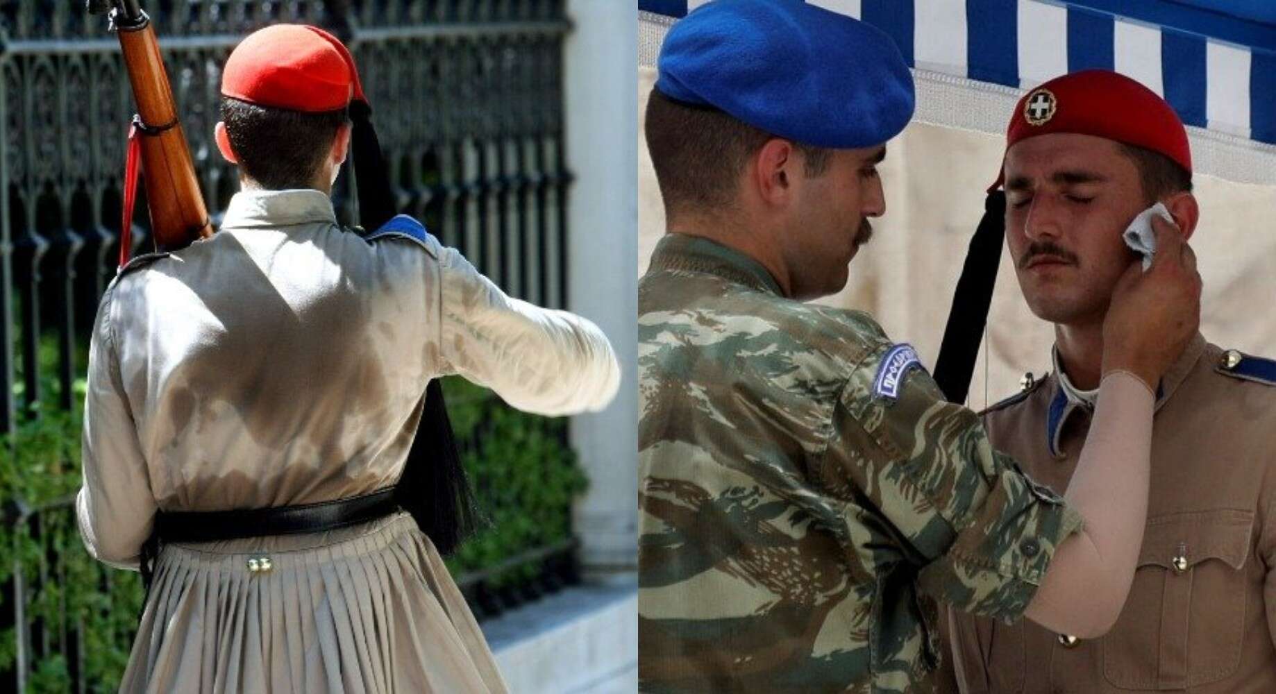 Ο λόγος για τους εύζωνες, οι οποίοι παραμένουν ακλόνητοι στη θέση τους, στο Μνημείο του Αγνώστου Στρατιώτη, την ώρα που υδράργυρος ενδέχεται να φτάσει μέχρι και τους 43 βαθμούς Κελσίου.