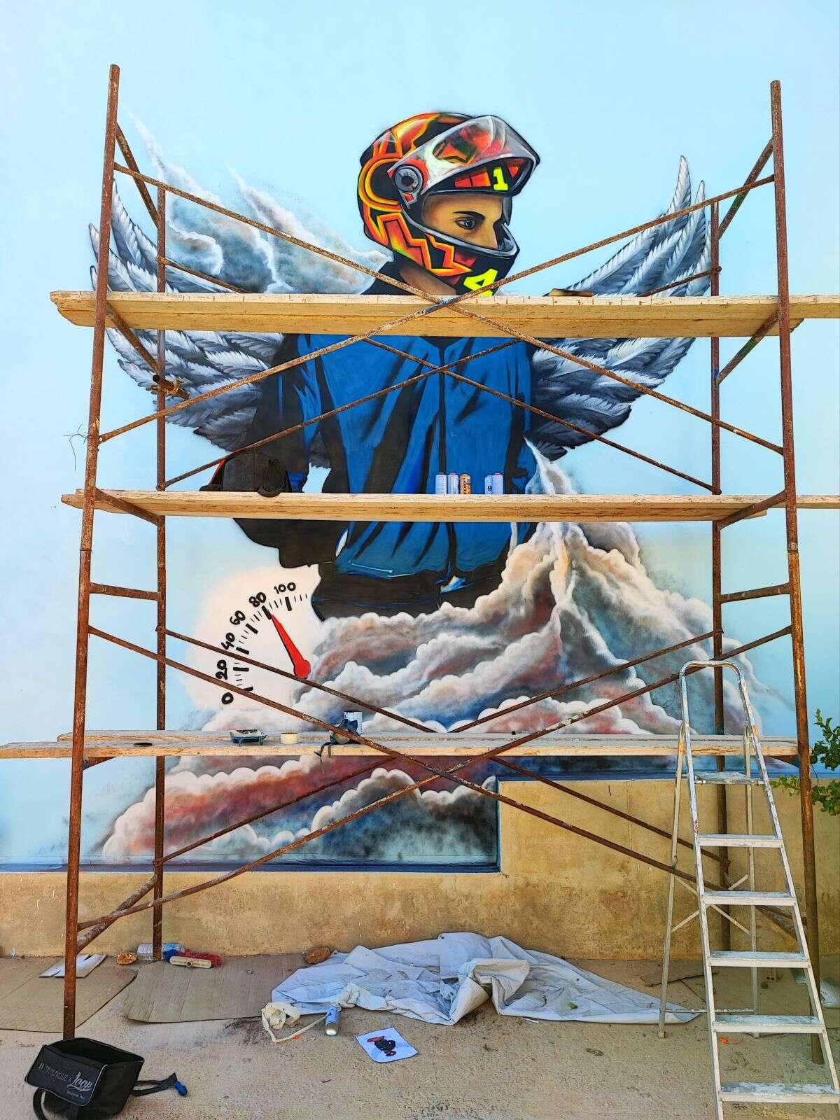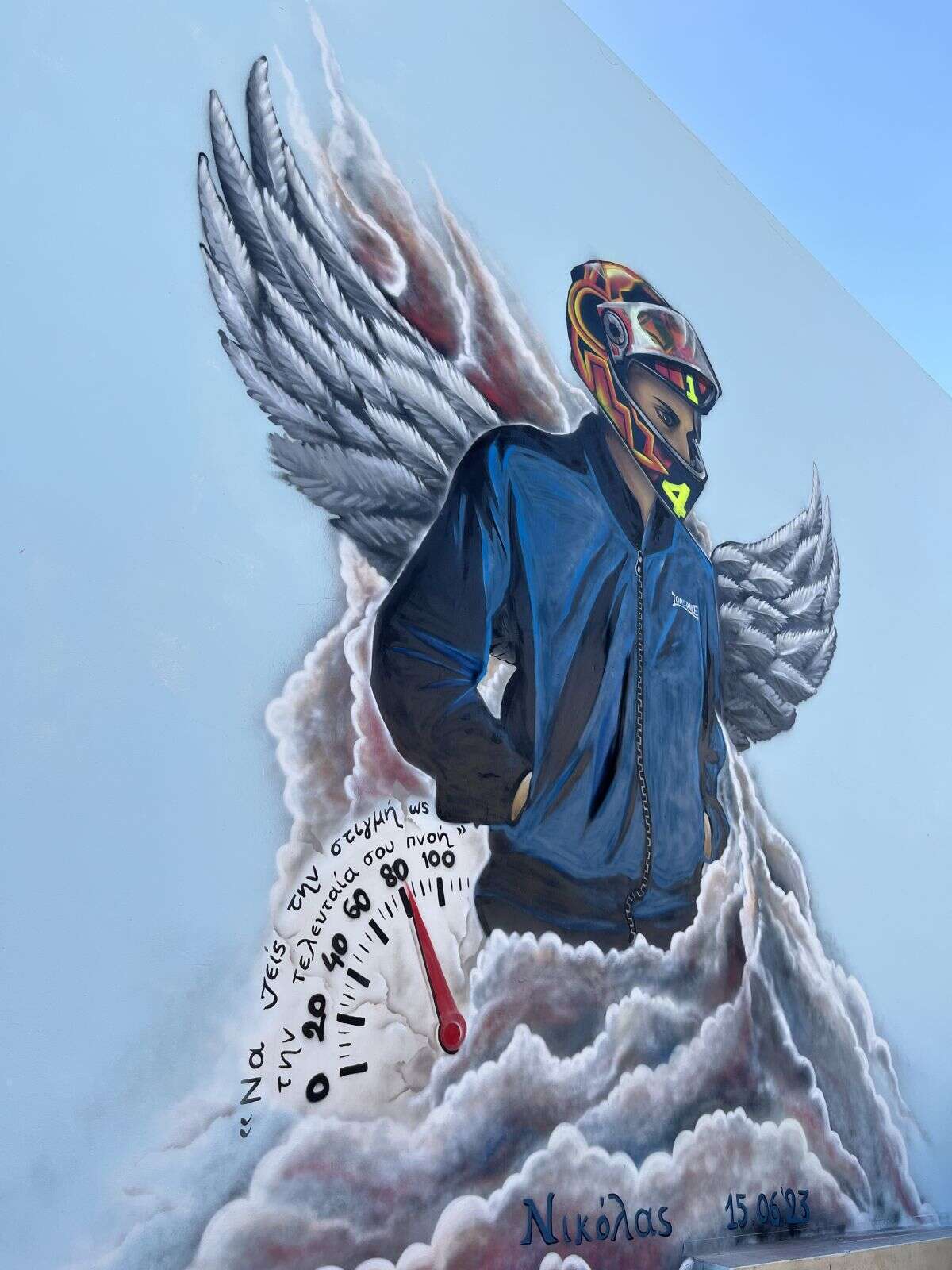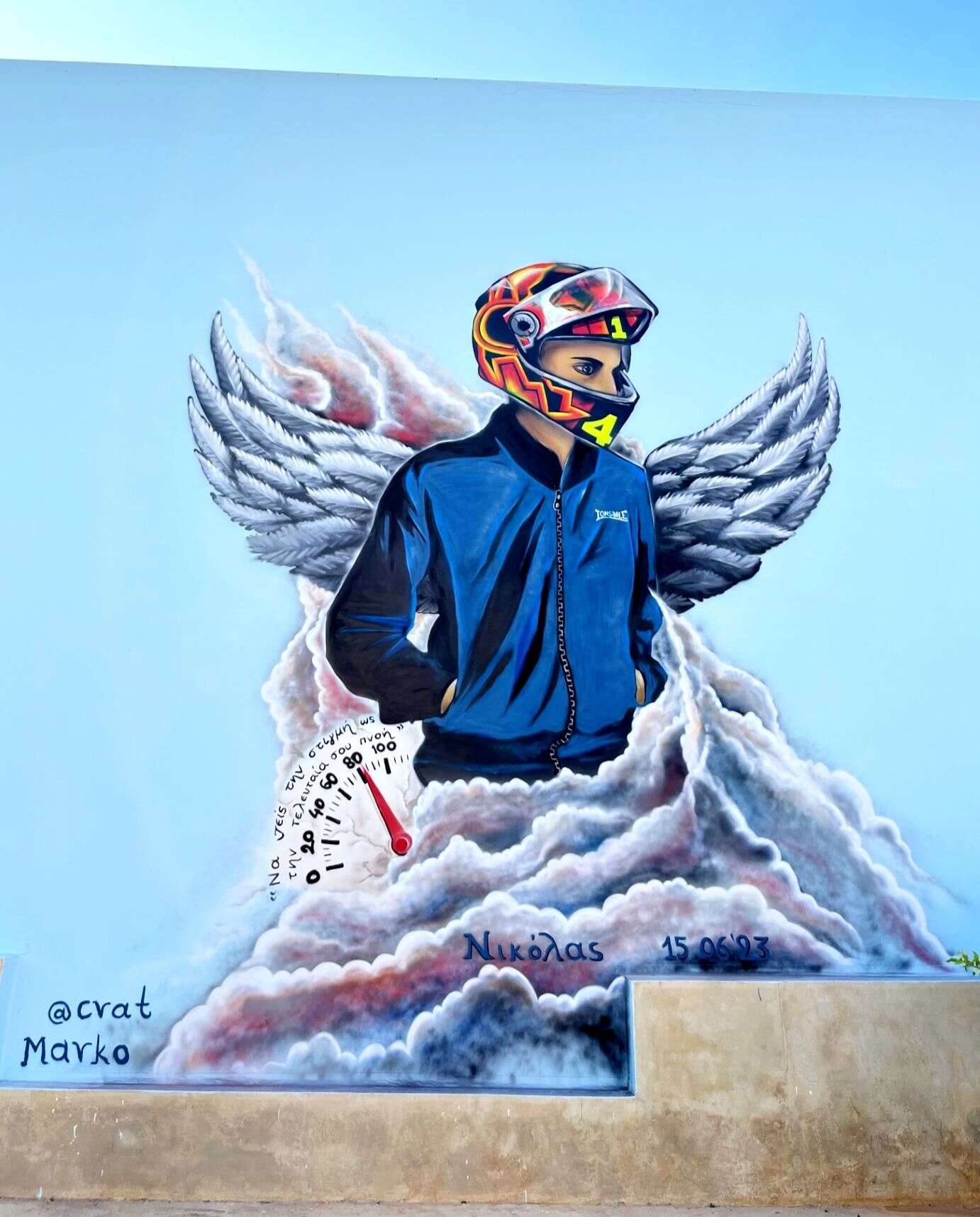 Το graffiti, ύψους 8 μέτρων, κρατά άσβεστη τη μνήμη του Νικόλα με το κράνος, το μότο του και τα φτερά αγγέλου.