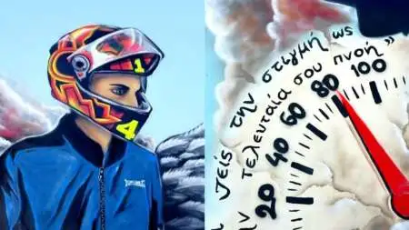 Ο 16χρονος βρήκε τραγικό θάνατο τα ξημερώματα της Πέμπτης 15 Ιουνίου όταν η μηχανή του έπεσε με σφοδρότητα πάνω σε τσιμεντένιο τοιχίο, σε δρόμο στην Ανάληψη Χερσονήσου. Τραγική ειρωνεία είναι ότι ο 16χρονος φορούσε το προστατευτικό του κράνος, όπως ακριβώς αποτυπώνεται και στο graffiti.