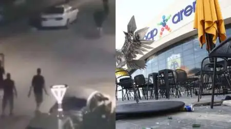 Μας φάνηκε πολύ περίεργο και ξαφνικά δεν περνάνε 3-4 λεπτά και βλέπουμε 250 άτομα να τρέχουν με ρόπαλα στα χέρια, με γκλομπ, με μολότοφ, να αρχίζουν να τα σπάνε όλα, να βαράνε όποιον βρίσκουν μπροστά τους, να βάζουν φωτιές. Τρομοκρατήθηκαμε στην αρχή. Έγινε συμπλοκή με παιδιά νεαρά, φιλάθλους της ΑΕΚ. Ανέβηκαν προς τη θύρα 21 και ξαναγυρίζουν πίσω. Ξανά αρχίζουν τα σπάνε ότι υπήρχε όρθιο, σπάσανε αυτοκίνητα, μαχαιρώνανε» τόνισε στην κάμερα της ΕΡΤ.