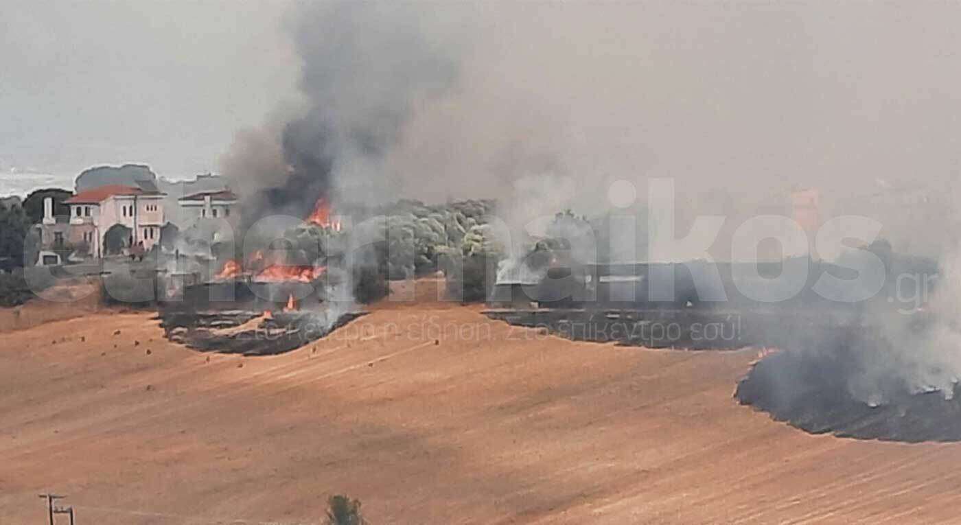 Στις φλόγες έχουν παραδοθεί σπίτια στον οικισμό Καμήλα, λόγω της φωτιάς στη Θέρμη Θεσσαλονίκης.