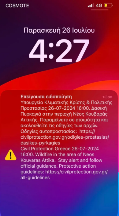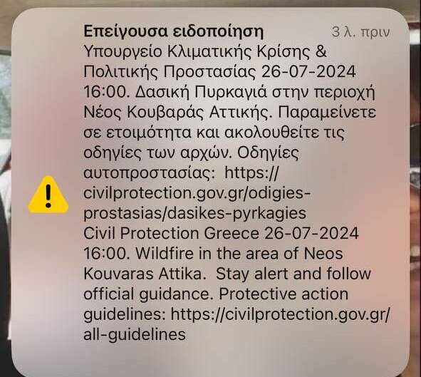 Αμέσως μετά το ξέσπασμα της πυρκαγιάς όλοι οι κάτοικοι της περιοχής αλλά και των γύρο οικισμών είδαν να τους έρχεται μήνυμα από το 112, το οποίο τους ενημέρωνε για την κατάσταση που επικρατούσε εκείνη την ώρα.