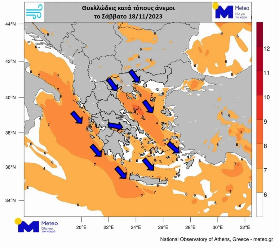 Α. Θυελλώδεις βορειοδυτικοί άνεμοι εντάσεως 8 με 9 και πρόσκαιρα με ριπές έως 10 μποφόρ θα πνέουν στα δυτικά και ανατολικά πελάγη. Επίσης πολύ ισχυροί βορειοδυτικοί άνεμοι θα πνέουν σε αρκετές ηπειρωτικές περιοχές κυρίως της Μακεδονίας και στα ανατολικά τμήματα της Θεσσαλίας και της Εύβοιας. Οι άνεμοι σταδιακά θα εξασθενήσουν από το απόγευμα της Κυριακής (19-11-23).