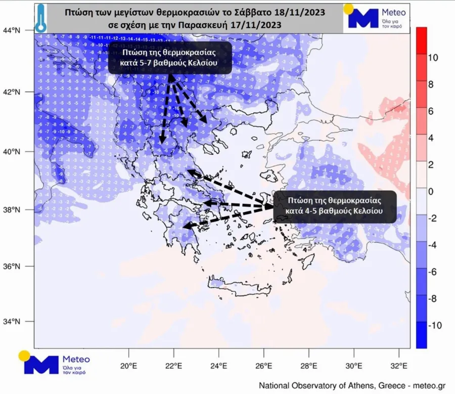 Γ. Η θερμοκρασία θα υποχωρήσει κατά 6 με 8 βαθμούς Κελσίου σήμερα Σάββατο στα κεντρικά και βόρεια και αύριο Κυριακή και στην υπόλοιπη χώρα.