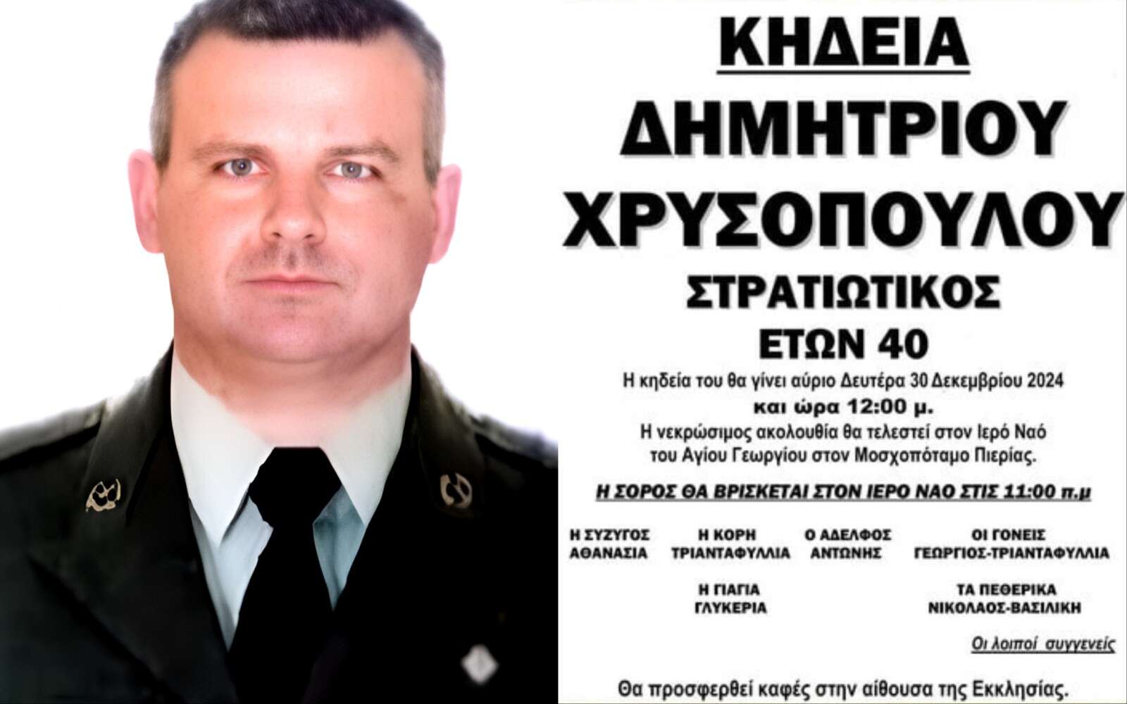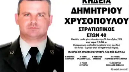 Ένας 40χρονος στρατριωτικός, ο Δημήτρης Χρυσόπουλος, “έφυγε” από τη ζωή, σκορπώντας θλίψη στην οικογένειά του, εν μέσω γιορτινής περιόδου.